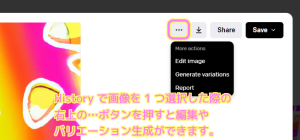 ダリ2-History-で画像を1つ選択した後に右上の…ボタンを押すとメニューから編集やバリエーション生成ができます。