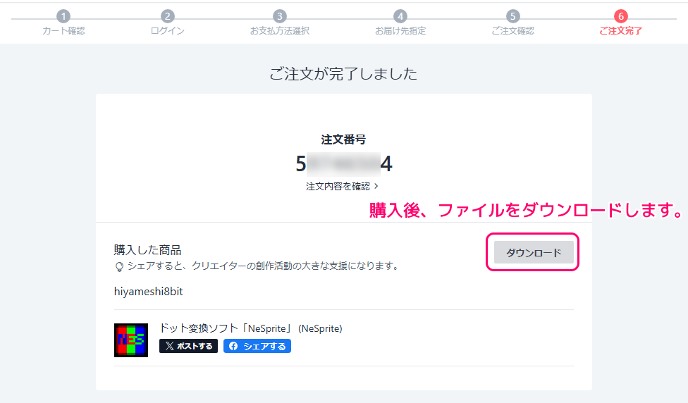 ※ダウンロードのページには、「ドット変換ソフト「NeSprite」 – hiyameshi8bit – BOOTH」で「購入済み」ボタンを押すことでもアクセスできます。