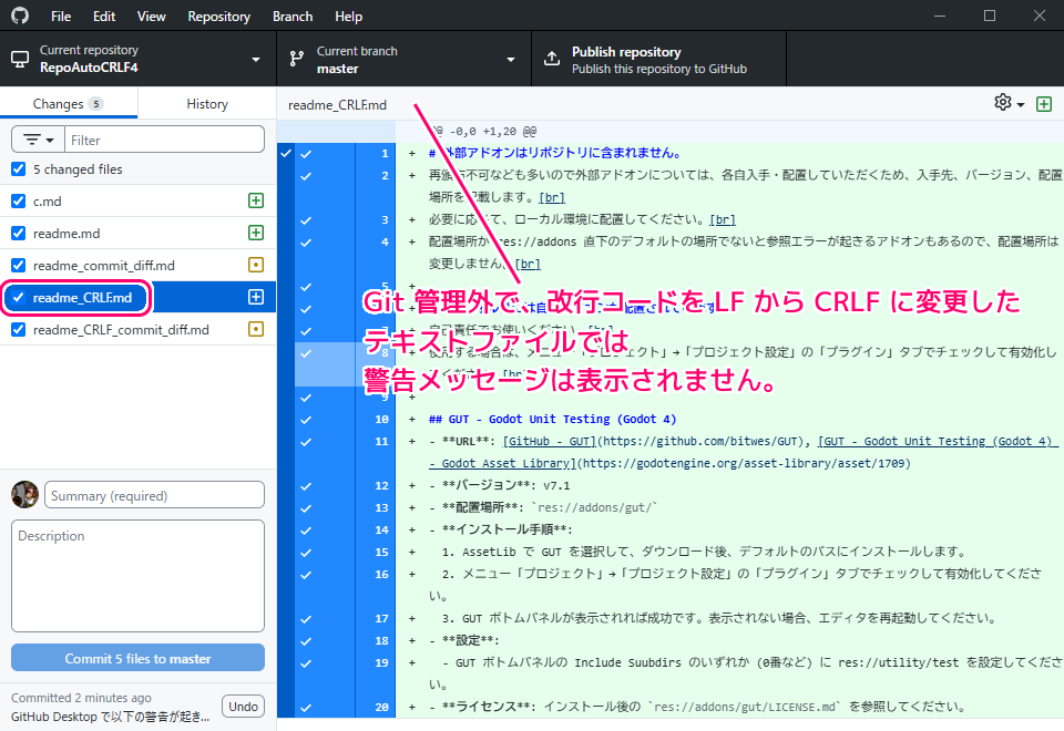 GitHub Desktop アプリの差分の改行コードに関する警告の表示条件の調査改行コード LF と CRLF の差5
