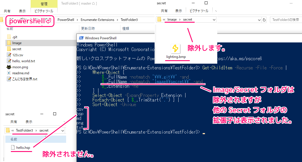 Where-Object コマンドレットの -nomatch で指定した .git フォルダ内にある .sample 拡張子は、処理から除外されたので表示されませんでした。