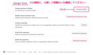 GitHub 作成したリポジトリの設定を非公開から公開に変更して一般公開する3