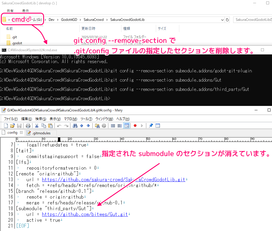 以下のコマンドプロンプトの入力では、3つの addons フォルダ内に配置したサブモジュールのセクション削除しています。
