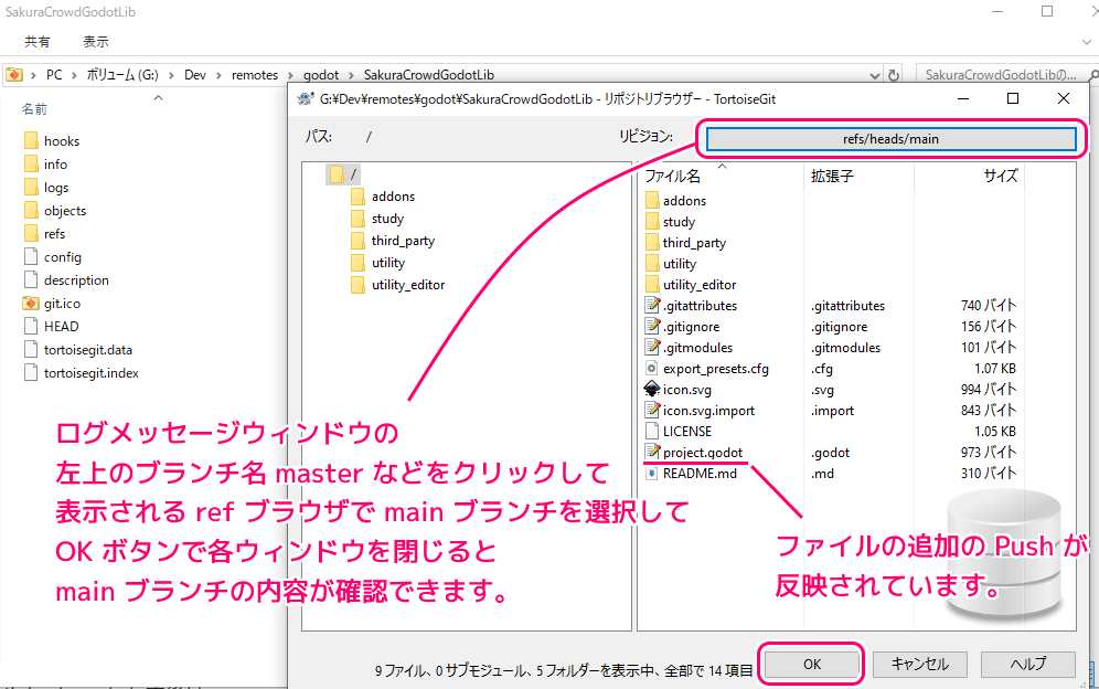 先ほどと同じく「ログメッセージ」ウィンドウに、選択した main ブランチのコミット履歴が表示されるので、右下の OK ボタンを押します。