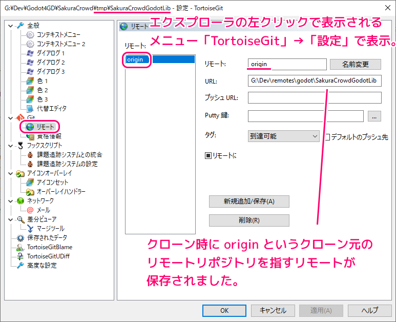 クローンの後、リモートを設定していないのに、自動的に origin という、クローン元のリモートリポジトリの URL を持つリモートが保存されました。