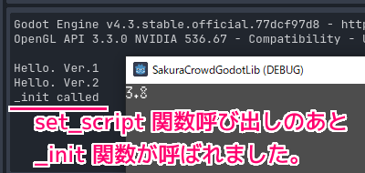 set_script メンバ関数の説明によると、その内部で、引数で渡されたスクリプトリソース(例では GDScript )を新たに new で生成するため、そのスクリプトの _init イベント関数が呼び出されます