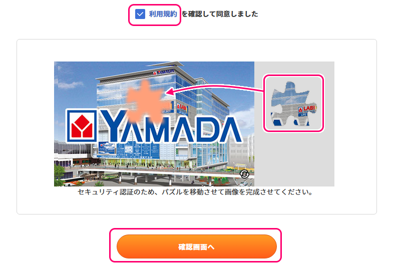 利用規約に同意後、利用規約のチェックボックスにチェックをいれて、セキュリティ認証のパズルを操作してから、「確認画面へ」ボタンを押します。