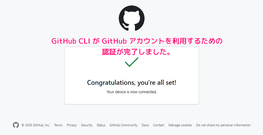 GitHub CLI が GitHub アカウントを利用するためのログイン認証が完了しました。