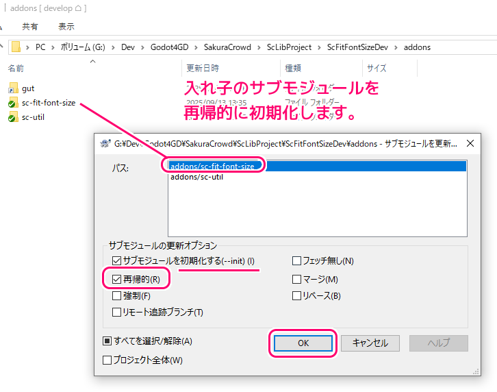 - 「サブモジュールの更新」ダイアログでは、「サブモジュールを初期化する」と「再帰的」にチェックしました。
