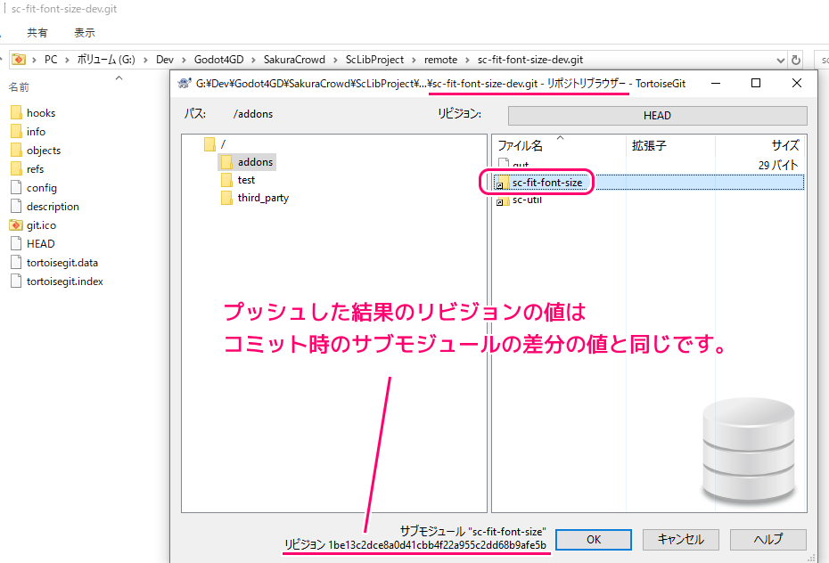 表示されたサブモジュール(例:sc-fit-font-size)を選択すると下側に、サブモジュールが参照するリビジョン(コミット位置)を表す 1be13c から始まるハッシュ値(SHA-1)が表示されています。