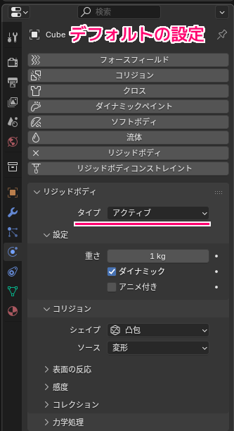 デフォルトのタイプがアクティブなので、特に変更しないでサイコロのリジッドボディの設定は完了です。