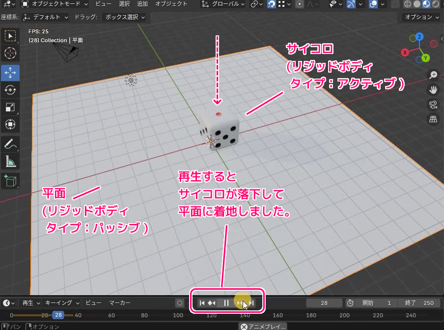 スペースキーを押してアニメーションで、空中のサイコロが真下に落下して床に着地する物理演算のシミュレートが確認できます。