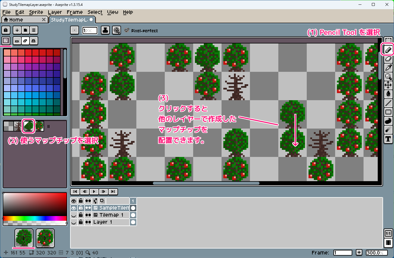 ウィンドウ右側の Pencil Tool (鉛筆のアイコン)を選択した後、タイルセットから使用するマップチップを選択して、タイルマップのマスをクリックすると、選択したマップチップが配置されました。