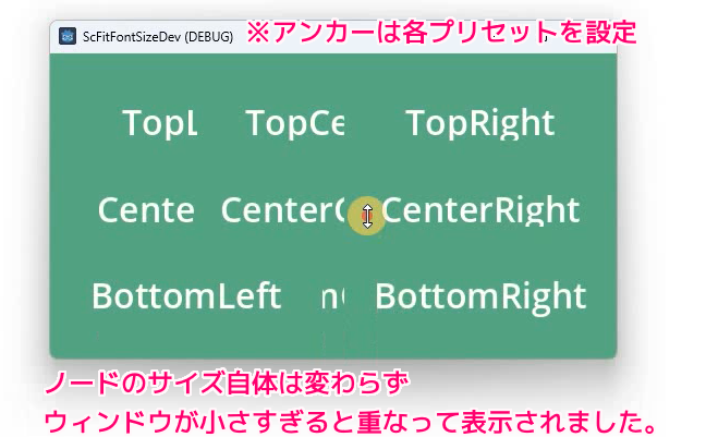 次に、アンカーのプリセットを各ラベルノードに設定したシーンを F6 キーで実行してウィンドウをリサイズします。