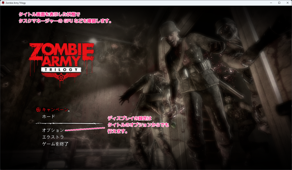 PC で Zombie Army Trilogy を起動すると、PC 内のファンの音がうるさくなり、タスクマネージャーをみると GPU 使用率が 9 割になって高負荷が続いていたので、ディスプレイの一部の設定を変更した例と、使用率の変化を紹介します。