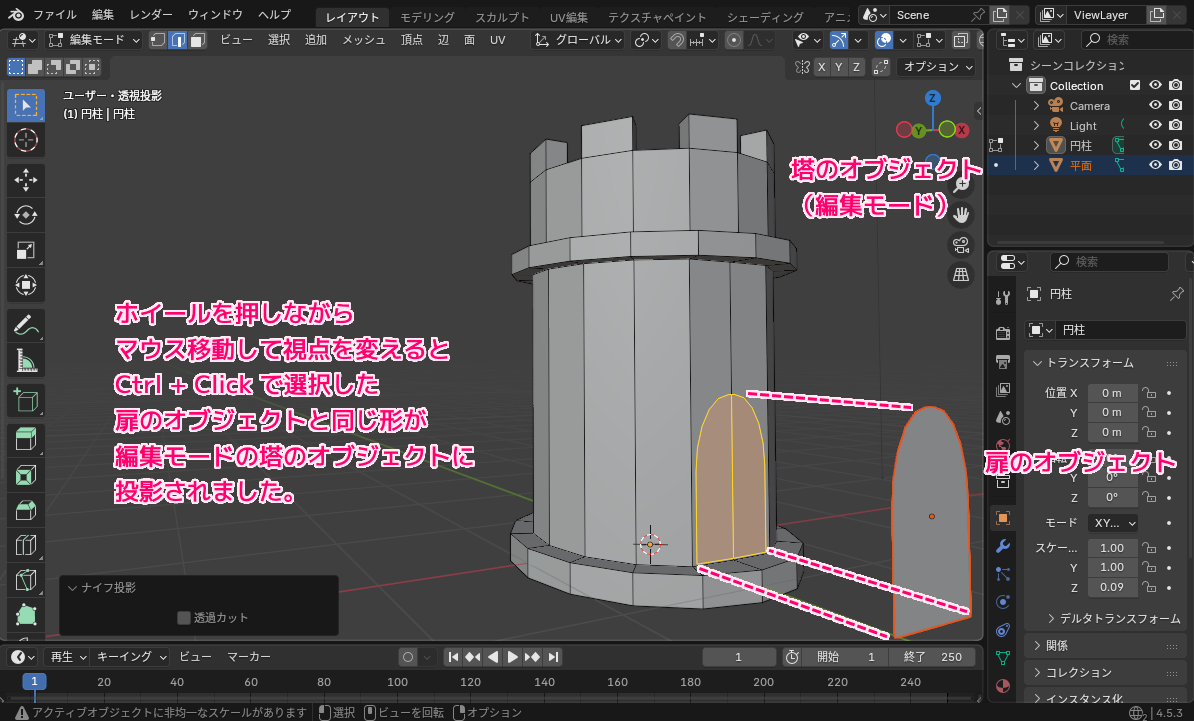 • ナイフ投影」を使用して、編集モードの塔のオブジェクトに、編集モードではない扉のオブジェクトの形の面を投影して、塔のオブジェクト内に扉の形の面を作成しました。