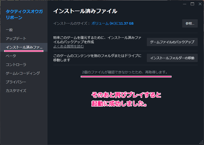 ゲームファイルの整合性確認とファイルの再取得による対処