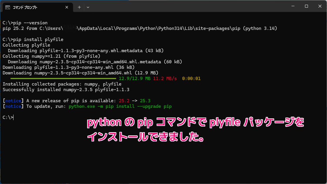pip install インストールするパッケージ名plyfile パッケージのダウンロードとインストールの一連の処理が、十数秒で完了しました。