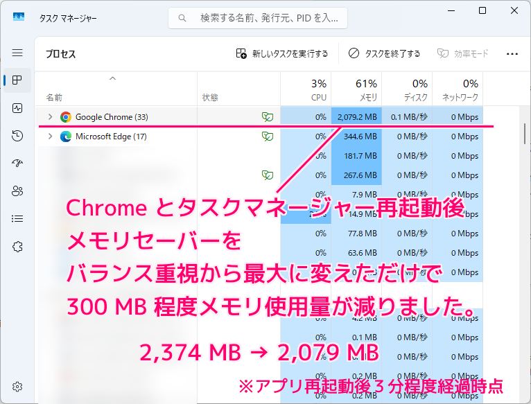 - Google Chrome のメモリセーバーの度合いを、「バランス重視(推奨)」から「最大」に変更しただけで、メモリ使用量が2.37 GB から 2.07 GB までおよそ 300 MB メモリ使用量が減少しました。