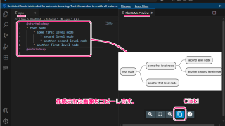 Visual Studio Code にインストールした、テキストから UML やマインドマップなどを作図できる PlantUML エクステンションのプレビュータブに表示された図の画像を保存する手順を紹介します。プレビュータブの「コピー」ボタンを押して、クリップボードに図の画像をコピーします。