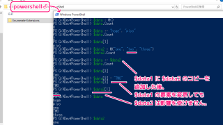 Windows に標準搭載されている、マイクロソフトが開発した .NET フレームワークが利用できるオブジェクト指向のコマンドラインインタプリタ (CLI) PowerShell で、配列の作成、配列への要素数の取得、要素の取得・設定、要素の追加についての用例を紹介します。