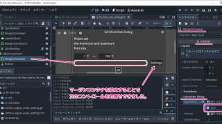 ゲ制 Godot4 ダイアログの MarginContainer を使った右寄せ 無料・軽快な2D/3D用のゲームエンジン Godot Engine 4 で、ダイアログの基礎となるクラス AcceptDialog に、 Container の派生クラスを MarginContainer を配置に追加して、右隣の Control (例:Button)をダイアログの端に右寄せする設定例を紹介します。 2026.01.31 ゲ制