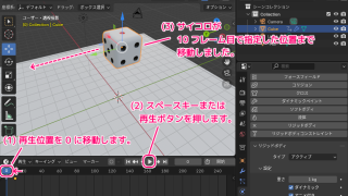無料で3DCGやアニメーションが作成できるBlenderで、リジッドボディを物理演算プロパティで設定した Cube (立方体) がベースのサイコロを、空中で直線的に移動させるタイムラインの設定例を紹介します。リジッドボディの物理演算ではなくアニメーションで移動させるための「アニメ付き」プロパティの設定も紹介します。