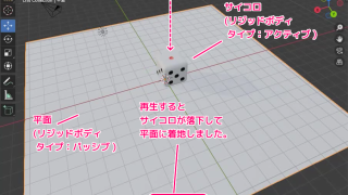 無料で 3D CG やアニメーションが作成できる Blender で、Cube (立方体) をベースにしたサイコロを、Plane (平面) の床に落下させる設定例を紹介します。物理演算プロパティの Rigid Body (リジッドボディ、剛体)を設定して、再生してアニメーションを確認します。